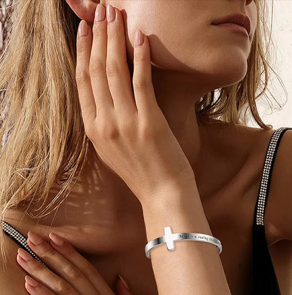 With an open cuff design, this bangle not only stands out in terms of aesthetics but also serves as a subtle reminder of faith through its inscription of a treasured Jesus Bible verse. Ideal for everyday wear or special gatherings, this fashionable bracelet blends spirituality with style, making it a perfect gift for yourself or a loved one. Embrace your beliefs with this stunning symbol of devotion.